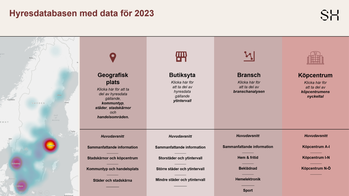 I 2023 års rapport redovisades för första gången hyresdata på stads- och köpcentrumnivå, något som länge har varit efterfrågat. I år har jämförbarheten förbättrats ytterligare och du kan se hyresnivåer utifrån geografisk plats, lokalens storlek och bransch. Databasen fortsätter att växa och omfattar nu närmare 20 procent av den kedjeanslutna sällanköpsvaruhandeln.