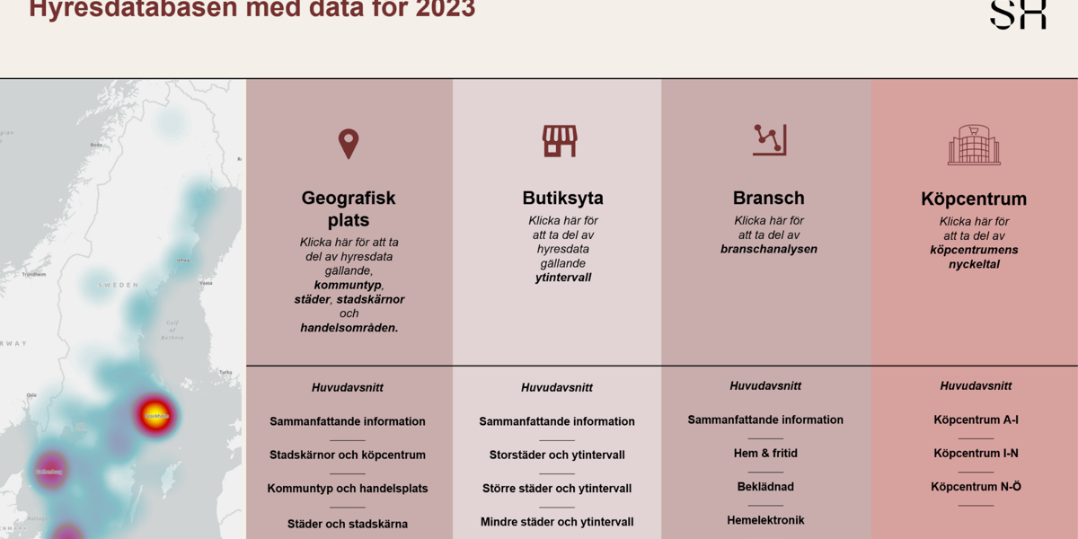 I 2023 års rapport redovisades för första gången hyresdata på stads- och köpcentrumnivå, något som länge har varit efterfrågat. I år har jämförbarheten förbättrats ytterligare och du kan se hyresnivåer utifrån geografisk plats, lokalens storlek och bransch. Databasen fortsätter att växa och omfattar nu närmare 20 procent av den kedjeanslutna sällanköpsvaruhandeln.