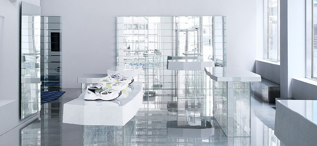Axel Arigatos butik på Biblioteksgatan i Stockholm är snyggt designad, men utan kassadiskar. Ett så klart helt medvetet val då man vill ge mer utrymme till produkterna samt vill möta kunden på golvet vilket skapar en mer naturlig ingång till samtal.