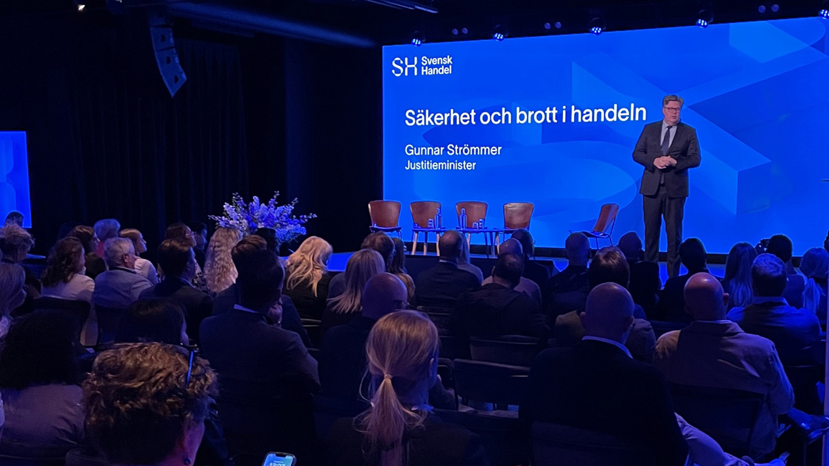 I en nästintill fullsatt sal på Sergel Hub i Stockholm inledde justitieministern med att berätta att lag- och ordningsfrågor nu stod högt upp på prioriterade frågor hos väljarna, och att han förstod den frustration många handlare känner när de på daglig basis utsätts för allehanda brott.