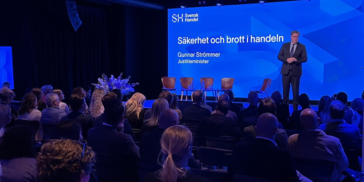 I en nästintill fullsatt sal på Sergel Hub i Stockholm inledde justitieministern med att berätta att lag- och ordningsfrågor nu stod högt upp på prioriterade frågor hos väljarna, och att han förstod den frustration många handlare känner när de på daglig basis utsätts för allehanda brott.