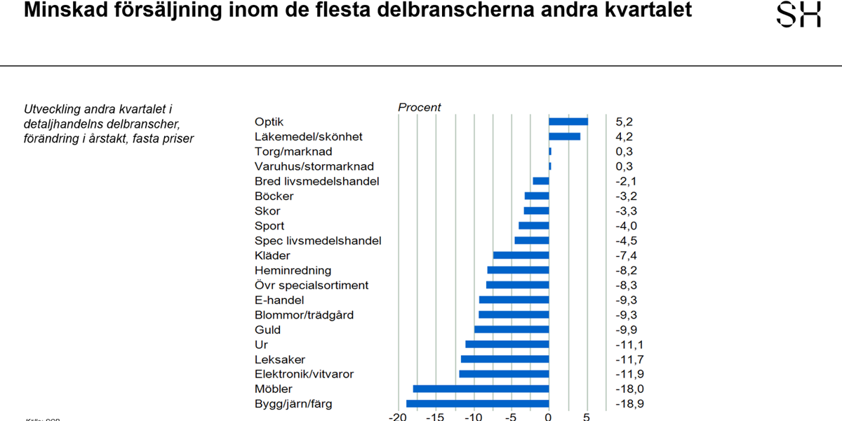 Det vi ser nu är en bred nedgång av konsumtionsutgifterna. Detaljhandeln var först ut men nu sjunker annan konsumtion, som till exempel restaurang- och hotellbesök. Detaljhandeln backar för 15:e månaden i rad. Optik, läkemedel, skönhet och böcker ökar något. Kläder sticker ut positivt och har visat ganska goda siffror senaste perioden, medan dyrare sällanköpsvaror som möbler samt bygg- och järnvaror går sämst. Bygg- och järnhandeln har backat cirka 25 procent på två år.