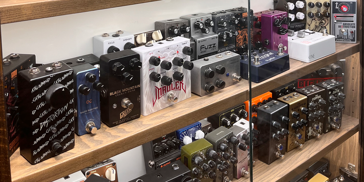 Men det är som sagt pedalerna som är i fokus. Från enkla ekoeffekter till avancerade som kan sampla in alla möjliga ljud för att låta dem komma ur gitarren. De säljer både svenska och utländska märken. Ibland hittar de en unik tillverkare i Australien, ibland i Tyskland. Vissa pedaler görs bara i mycket begränsade upplagor och då gäller det att hänga på snabbt när de släpps till försäljning. Det gäller att hänga med. Det går fort. Plötsligt trendar en pedal och då köper man in den.