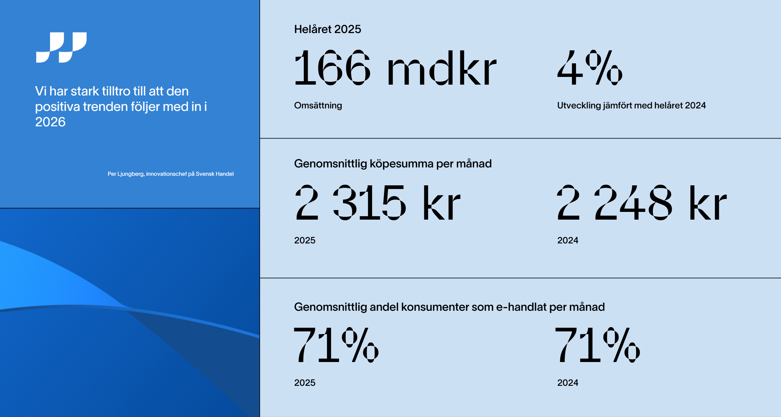 Svensk Handels E-handelsindikator skattar e-handelns omsättning under helåret 2025 till 166 miljarder kronor. Det var en ökning med 4 procent jämfört med helåret 2024. 71 procent av konsumenterna e-handlade en genomsnittlig månad 2025. Det var en lika hög andel som året innan. Omsättningstillväxten förklaras alltså inte av att e-handelskonsumenterna blev fler utan att de handlade för högre köpesummor, i snitt 2 315 kronor per konsument och månad.