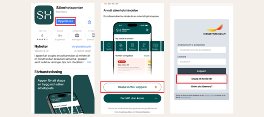 Alla som har ett konto i appen Säkerhetscenter idag och har blivit utloggade måste uppdatera appen och klicka på ”skapa konto” i appen för att verifiera sin mejladress.