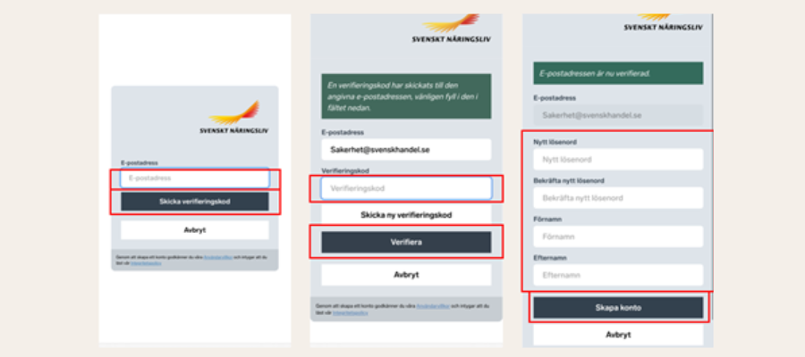 - Fyll i verifieringskoden som kommer via mail och tryck på ”Verifiera"