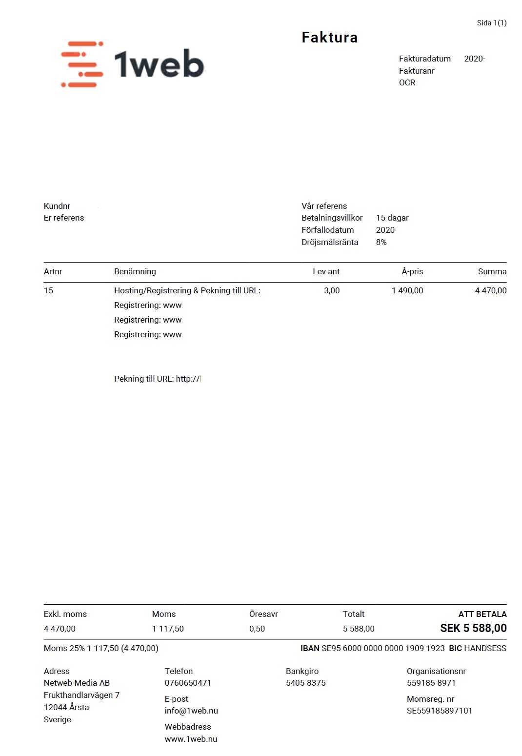 1web ringer upp och påstår att någon försöker lägga beslag på företagets domänadresser och erbjuder sig sedan att registrera dessa. När fakturan kommer så är summan betydligt högre än vad kunden uppfattade det som.