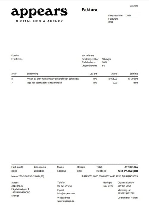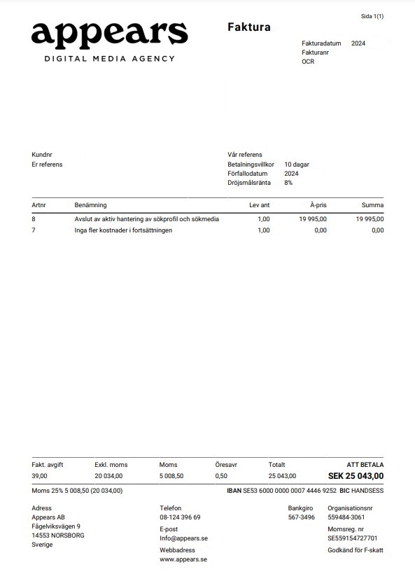 Appears Digital Media Agency skickar mail till företag om att deras kundkonto är på väg att stängas ner. Att företaget har en aktiv tjänst som hanterar företagsinformation genom en extern partner och för att avsluta detta tillkommer en slutkostnad. Detta trots att det inte finns något aktivt avtal.