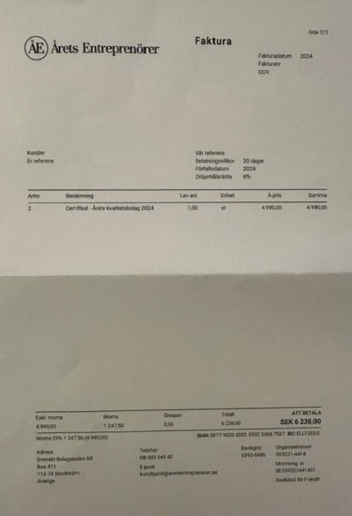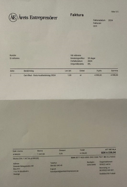Företagare beskriver att de känner sig vilseledda då de blir kontaktade av Årets Entreprenörer om att de har blivit utsedda till Årets Kvalitetsbolag 2024. I själva verket handlar det om att den som tar kontakt vill ha betalt för ett diplom/certifikat som kostar cirka 5000 kronor.