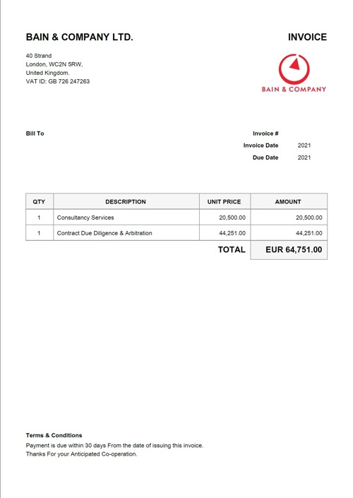 De drabbade företagen kontaktas via mejl av en som säger sig företräda BAIN & COMPANY LTD. I mejlet hävdar man att det finns en obetald faktura som behöver hanteras skyndsamt. I en del fall bifogas fakturan direkt, i andra fall bifogas den först när det utsatta företaget återkopplat på det första mejlet. Kort därefter dyker det upp ett mejl som ser ut att komma från det drabbade företagets chef/VD/CEO. I mejlet, som i själva verket också kommer från bedragaren, styrker man fakturans äkthet för att på så sätt övertyga mottagaren om att kravet och fakturan är legitim.