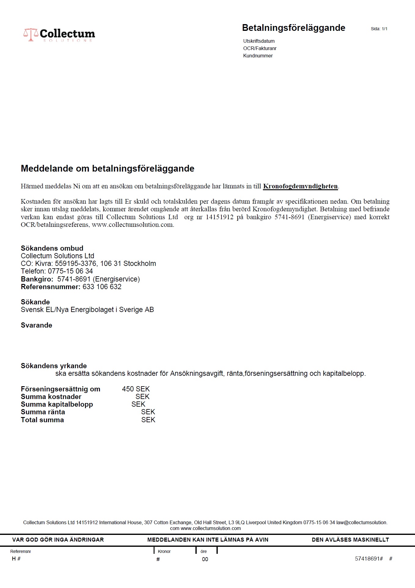 Meddelanden om betalningsföreläggande från Collectum Solutions Ltd