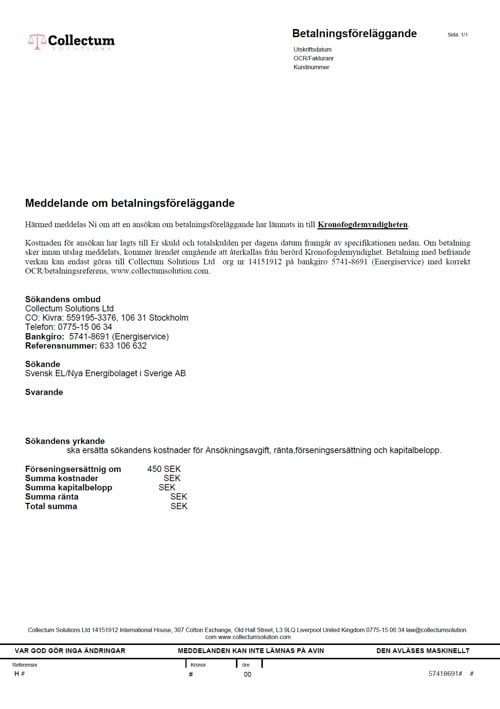 Företag som sedan tidigare har pågående ärenden med Förvaltningsel och Svensk El får nu ”meddelanden om betalningsföreläggande” från Collectum Solutions Ltd. Betalningsmottagare är Energiservice & Juridik AB med organisationsnummer 559195-3376 och bankgironummer 5741-8691. I meddelandet står det att en ansökan har lämnats in till Kronofogdemyndigheten.Många som har fått detta meddelande har tagit kontakt med Kronofogden för att sedan få till svar att det inte har kommit in något ärende från Collectum Solutions Ltd / Energiservice & Juridik AB.