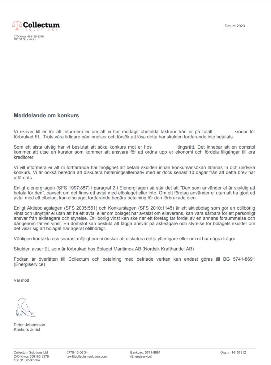 Just nu ser vi att Collectum Solutions skickar ut brev med rubriken ”Meddelande om konkurs” till företagare som tidigare har haft pågående ärenden med Maritimox AB (Nordisk Krafthandel AB). Ärendena med elbolaget som de hänvisar till är flera år gamla. I brevet skriver Collectum Solutions att de kommer att söka om konkurs mot mottagaren av brevet om de inte betalar en summa. Betalningsmottagare är Energiservice & Juridik AB med organisationsnummer 559195-3376 och bankgironummer 5741-8691.