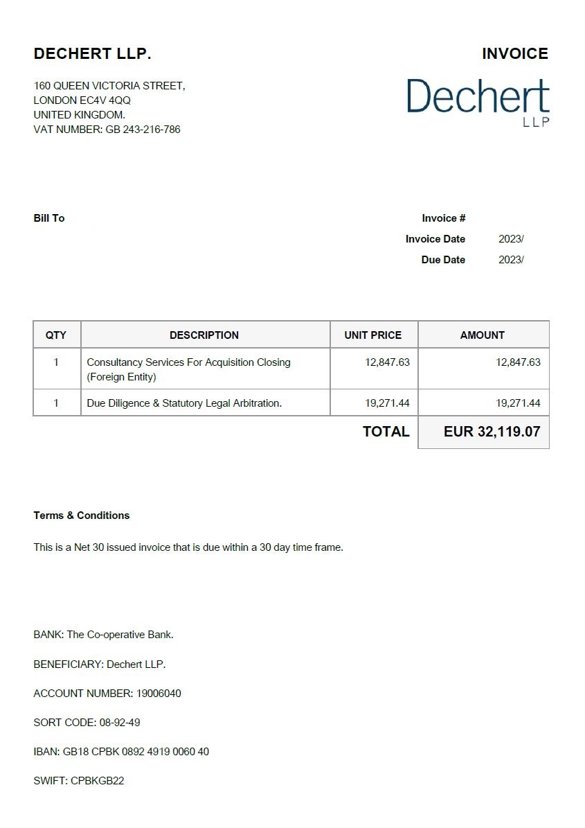 De drabbade företagen kontaktas via mejl av någon som säger sig företräda Dechert LLP finansavdelning. I mejlet hävdar man att det finns en obetald faktura som behöver hanteras skyndsamt. Kort därefter dyker det upp ett mejl som ser ut att komma från det drabbade företagets ekonomiavdelning. I mejlet, som i själva verket också kommer från bedragaren, styrker man fakturans äkthet för att på så sätt övertyga mottagaren om att kravet och fakturan är legitim.