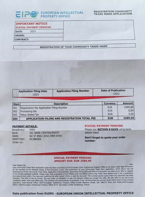EIPO European Intellectual Property Office skickar ut erbjudanden gällande varumärkesregistrering som företagare känner sig vilseledda av då erbjudandet är utformat som en faktura. På erbjudandet finns en uppmaning om att betala inom 8 dagar. I det finstilta står det dock att det endast är ett erbjudande.