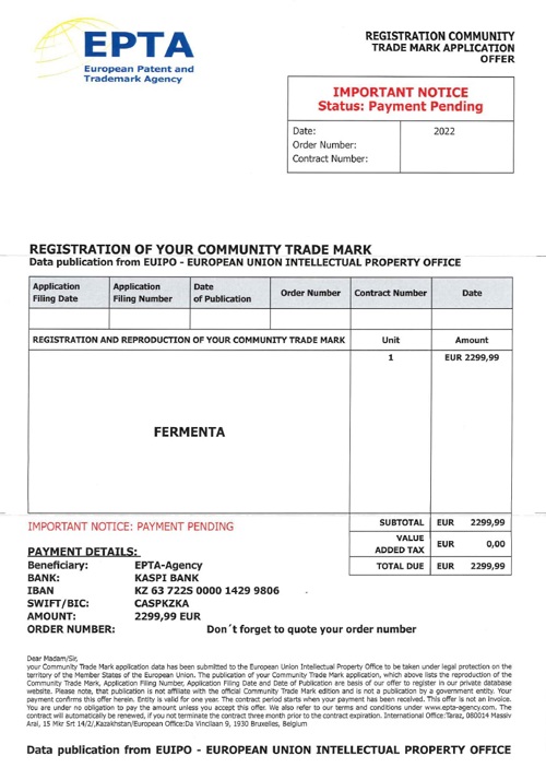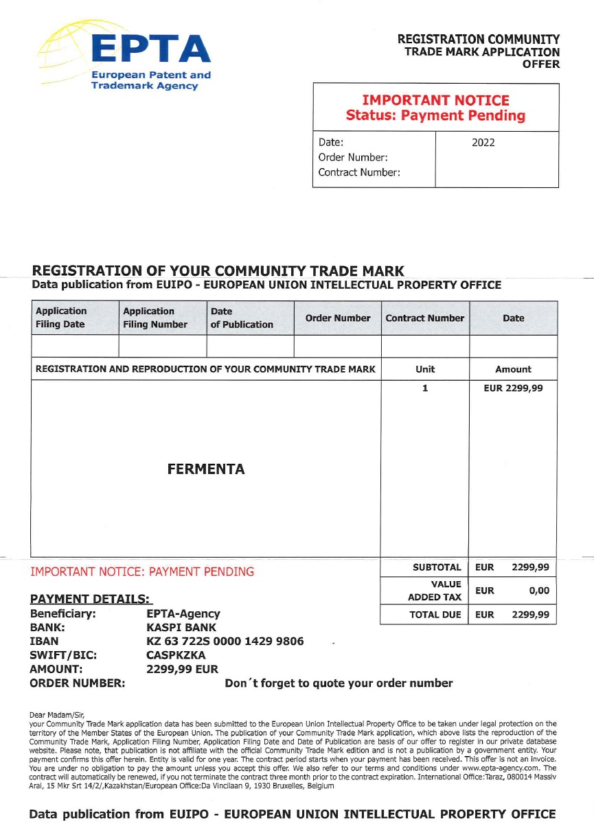 EPTA skickar ut erbjudanden som flertalet företagare uppfattar som fakturor. På erbjudandet finns en uppmaning om att betala 2299,99 Euro. I det finstilta står det dock att det endast är ett erbjudande om registrering av varumärke i en privat databas.