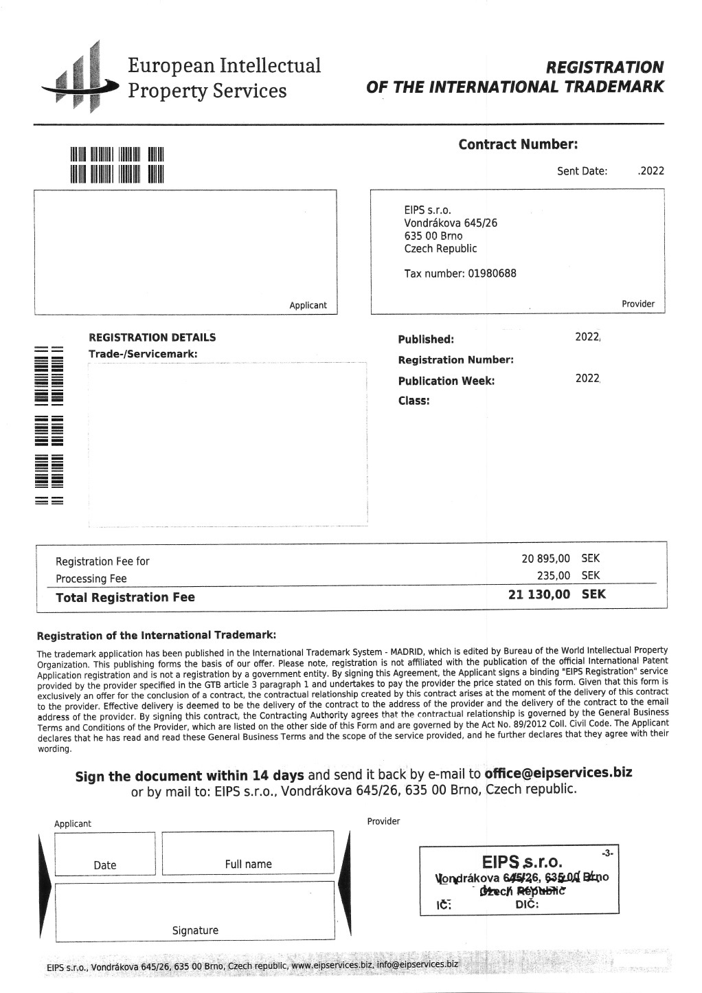 European Intellectual Property Services skickar ut erbjudanden gällande varumärkesregistrering som flertalet företagare känner sig vilseledda av. På erbjudandet finns en uppmaning om signera dokumentet inom 14 dagar. I det finstilta står det dock att det endast är ett erbjudande som inte kommer från den officiella varumärkesregistreringen.