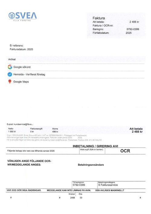 FF SVEA ALLA FÖRETAG ringer upp angående Google-tjänster och får det att låta som att man är deras nuvarande kund. Efter samtalet så skickar de en faktura, trots att man inte har beställt tjänsten. Man har aldrig varit deras kund. Det har inte funnits något avtal sedan tidigare.