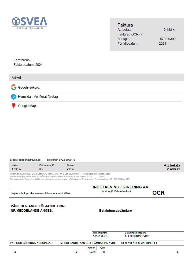 FF SVEA MARKNADSFÖRINGSBYRÅ ringer upp angående Google-tjänster och får det att låta som att man är deras nuvarande kund. Efter samtalet så skickar de en faktura, trots att man inte har beställt tjänsten. Man har aldrig varit deras kund. Det har inte funnits något avtal sedan tidigare.