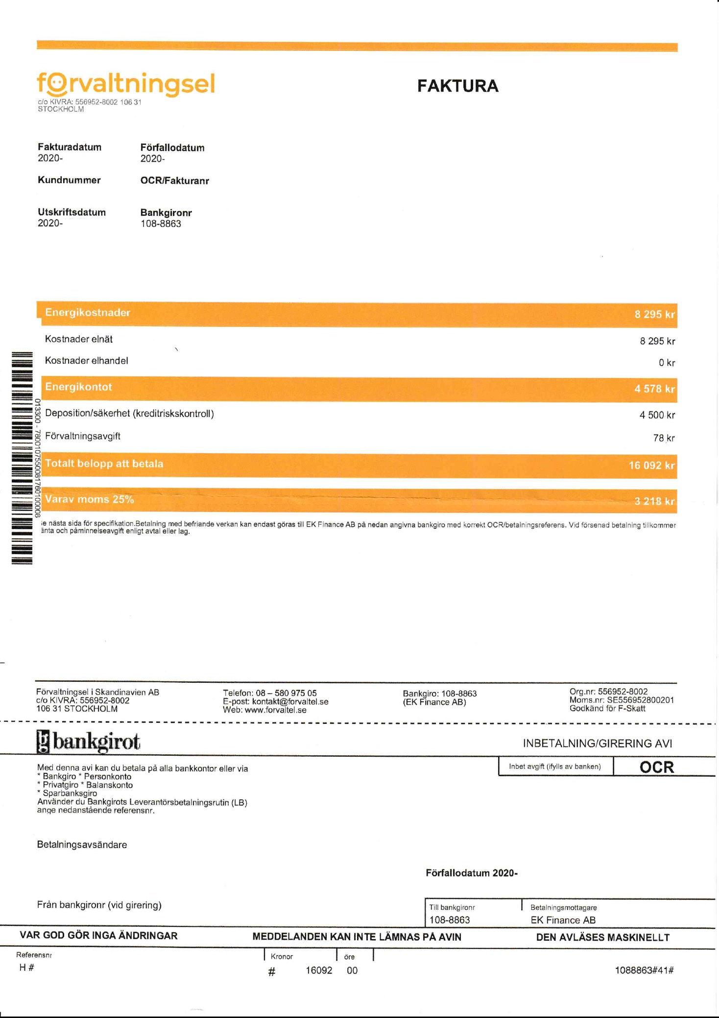 Bankgiro 108-8863, 5357-5379 5283-9594 EK Finans ABBetalningsmottgare EK Services AB Bankgiro 5527-4633, 5527-4625 5534-6076NY betalningmottagare: Energiservice /Aksin ML 559195-3376 Bankgiro 5741-8691