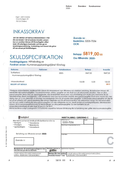 Företaget skickar ut Inkassokrav gällande slutfaktura på "Nummerupplysningstjänst Företag", utan någon som helst kontakt med det drabbade bolaget.