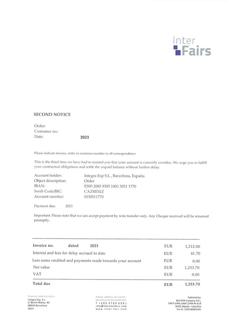 Inter Fairs sänder ut ett informationsbrev och uppdateringsblankett via mejl till drabbade företagare i samband med att man har besökt en mässa, företagare uppfattar detta som ett erbjudande om att registrera sig gratis i en databas på www.inter-fairs.com. I själva verket kostar tjänsten från 1212 Euro.