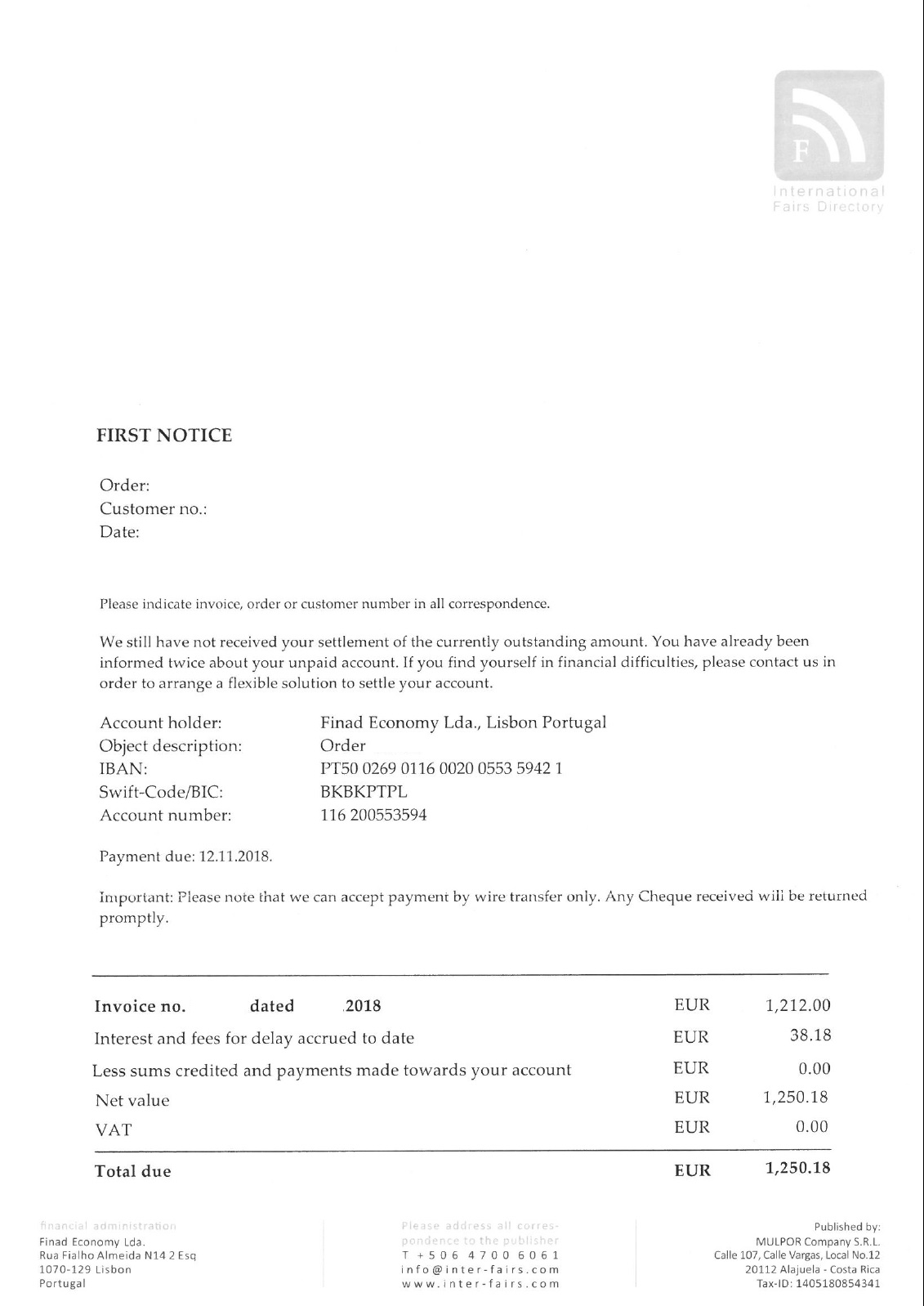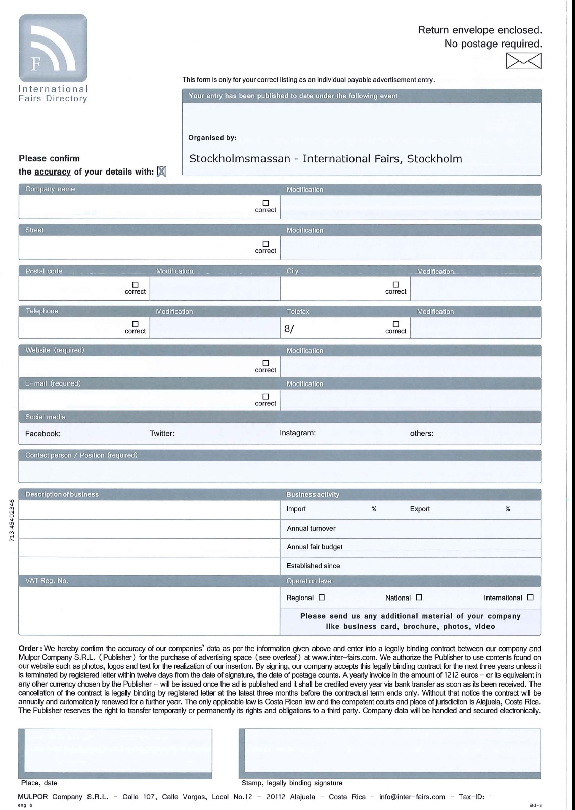 International Fairs Directory: Skickar ut ett informationsbrev och uppdateringsblankett i samband med att man är/har deltagit på någon mässa, man uppfattar detta som gratis databas på www.inter-fairs.com. I själva verket kostar det 1212 Euro.