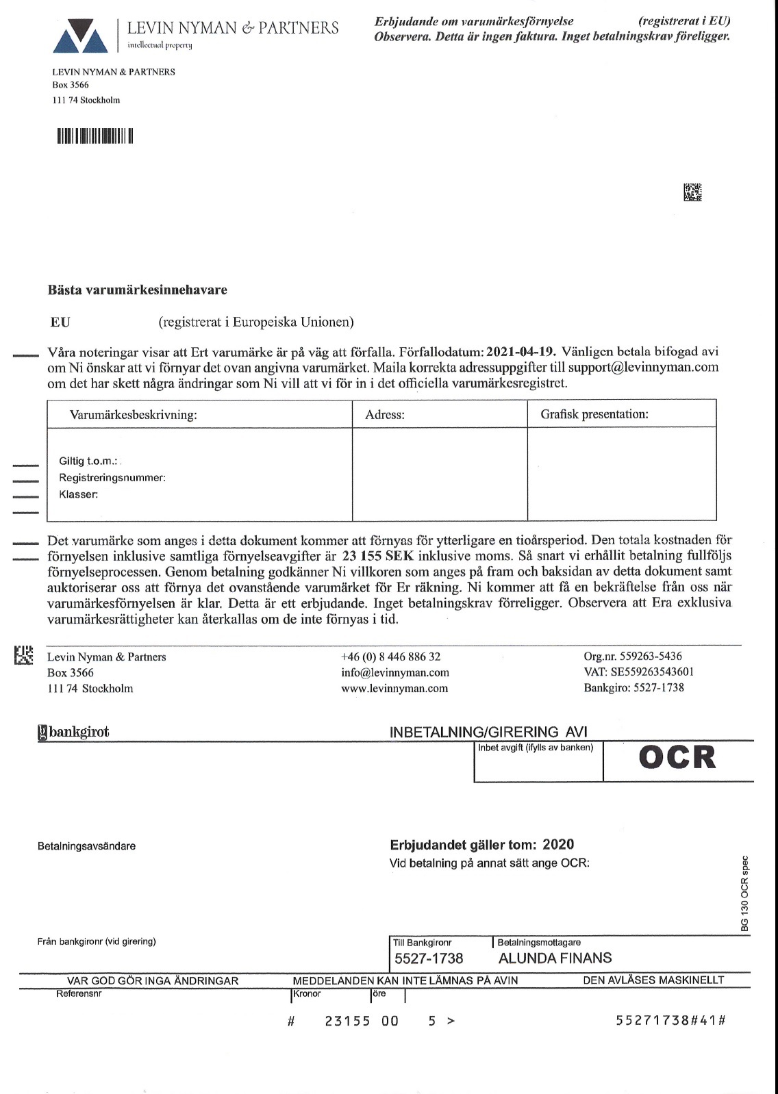 Mer information: LEVIN NYMAN & PARTNERS skickar ut erbjudanden som kan uppfattas som fakturor, angående varumärkesförnyelse. Blanketten kan lätt uppfattas som att man måste betala för att behålla sitt varumärke. I erbjudandet står det att varumärket är på väg att förfalla och att förnyelsen gäller en tioårsperiod.