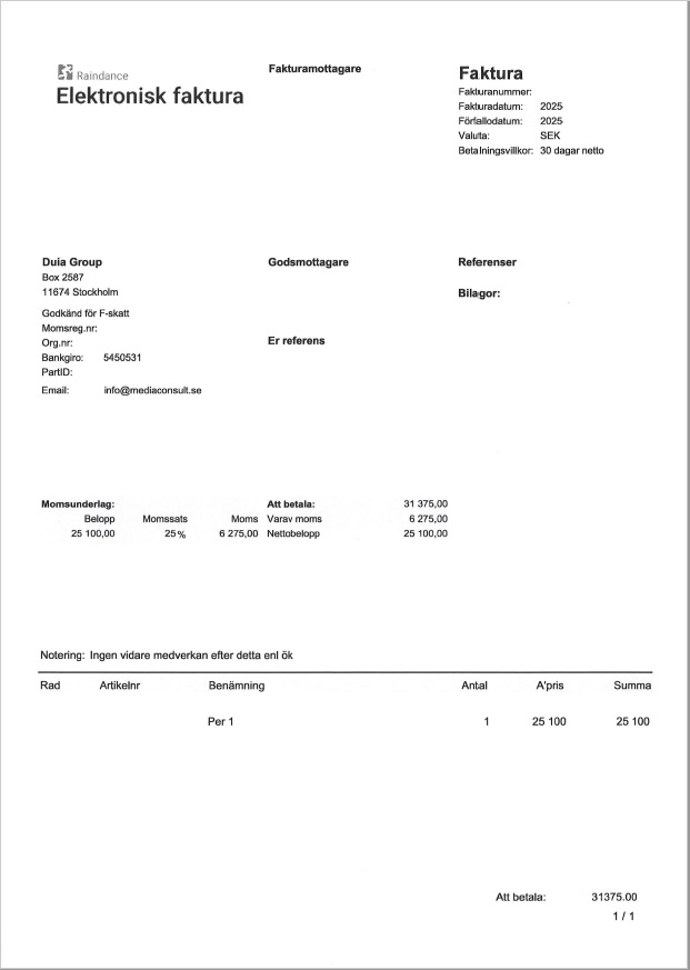 Observera! Dessa uppgifter är hämtade från fakturan och kan medvetet vara felaktiga.