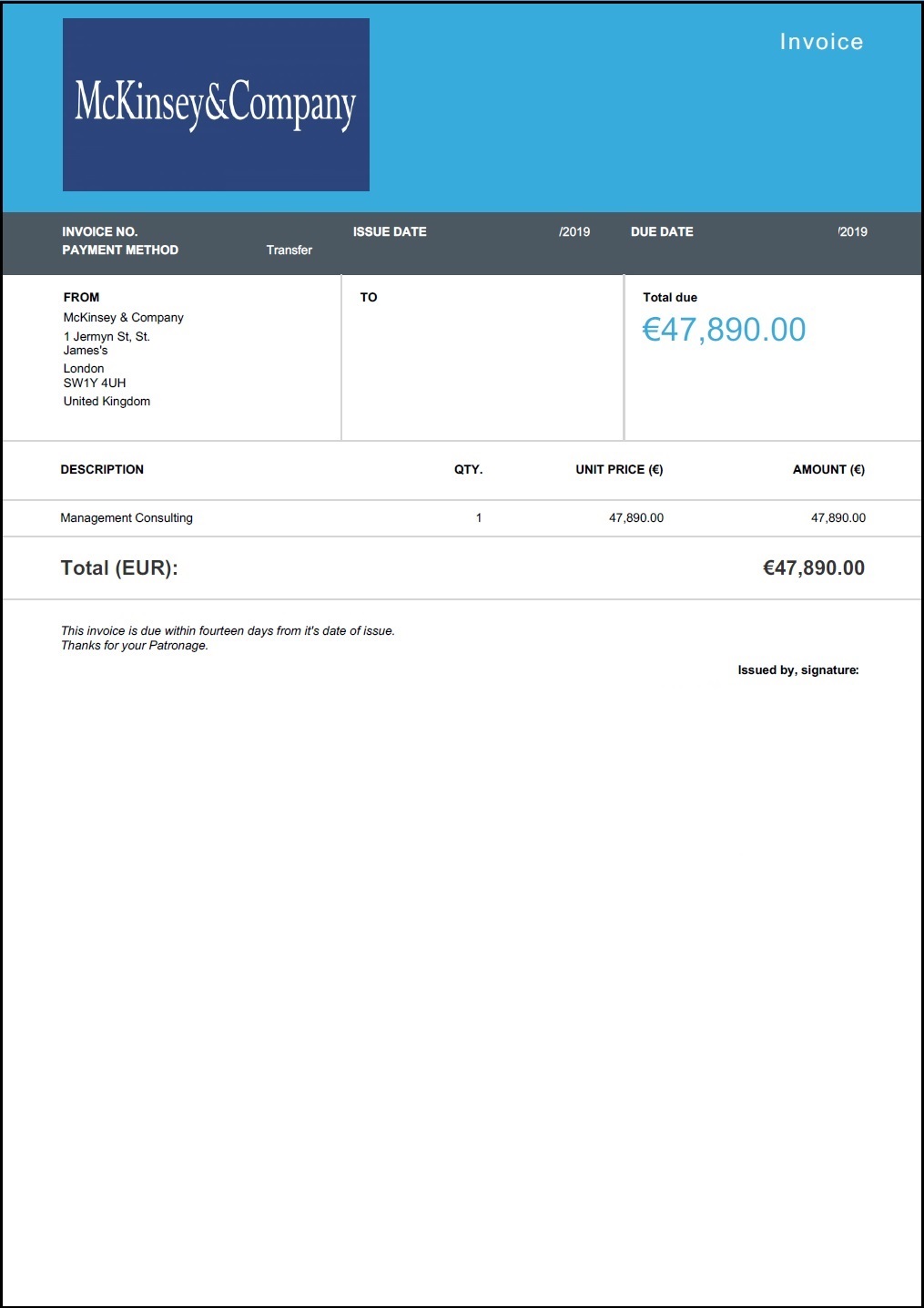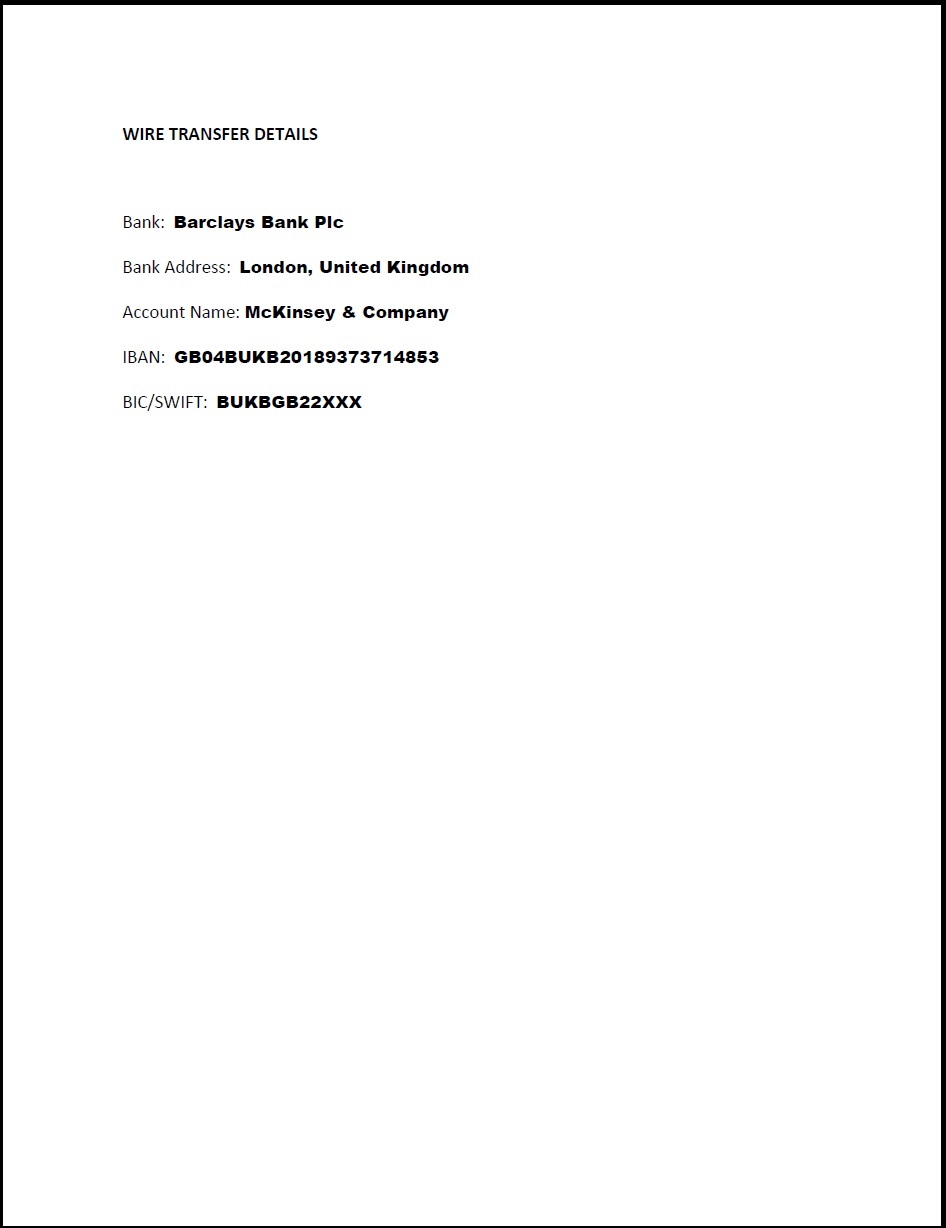 Bedragaren utger sig för att vara en högt uppsatt chef inom ditt företag och tar kontakt med din ekonomiavdelning/ekonomiansvarig via mejl för att försöka förmå denne att göra brådskande utbetalningar.Samme bedragare tar därefter kontakt med din ekonomiavdelning men utger sig då för att vara från Baker McKenzie, vilket naturligtvis inte stämmer, via mailadressen namn@bkermckenzie.com.Bedragaren skickar sedan betalningsuppgifter och en faktura på summor uppemot €50 000.