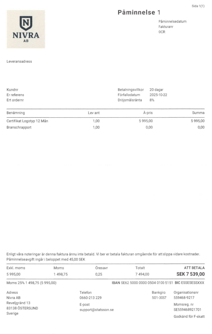 Observera! Dessa uppgifter är hämtade från fakturan och kan medvetet vara felaktiga.