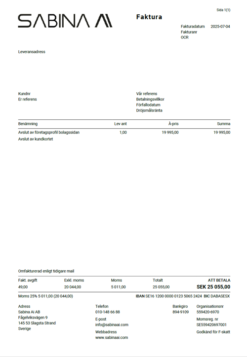 Observera! Dessa uppgifter är hämtade från fakturan och kan medvetet vara felaktiga.