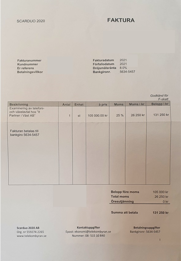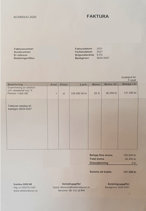 Telekombyrån hette fram tills den 2 september Scarduo 2020 AB. I samtalet presenterar de sig som Telekombyrån men på fakturorna står det Scarduo 2020. Detta kan givetvis komma att ändras framöver om de uppdaterar sina fakturautskick. Företaget har tydliga kopplingar till det tidigare publicerade företaget Telenet i Sverige AB.