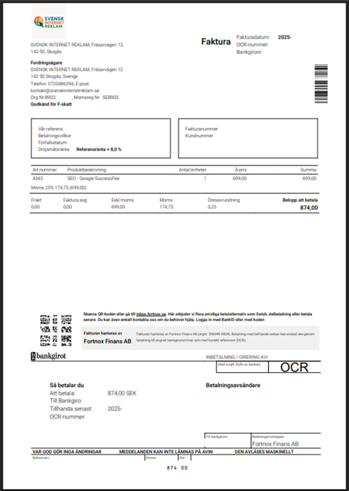 Observera! Dessa uppgifter är hämtade från fakturan och kan medvetet vara felaktiga.