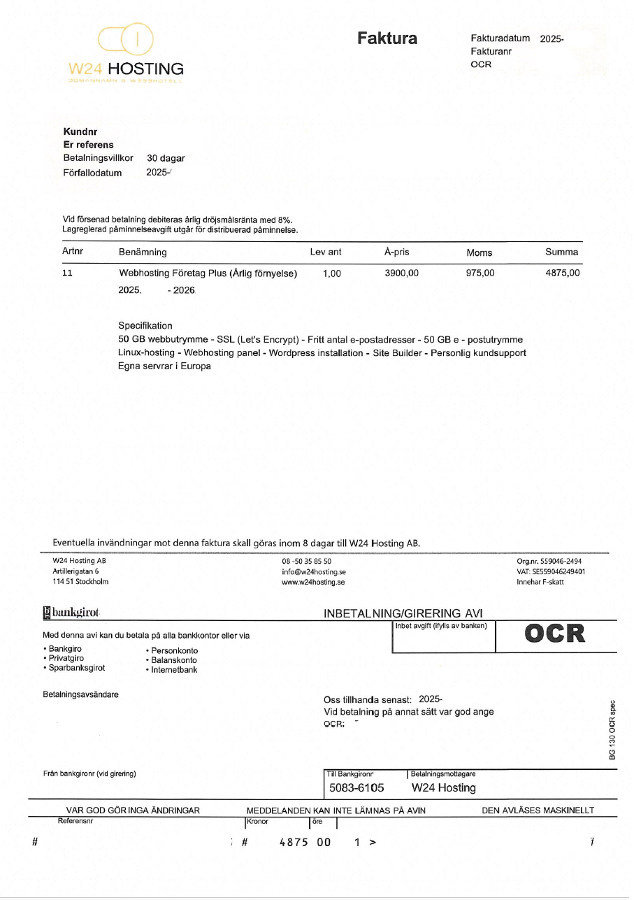 Observera att tidigare betalningar kan förekomma till Web Hosting Solutions 24 AB under föregående år, med start så tidigt som 2022. Verksamheten varningslistades för massutskick av erbjudanden utformade som fakturor - som om de betalades aktiverade ett löpande avtal.