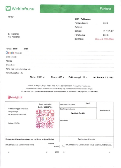 Observera! Dessa uppgifter är hämtade från fakturan och kan medvetet vara felaktiga.